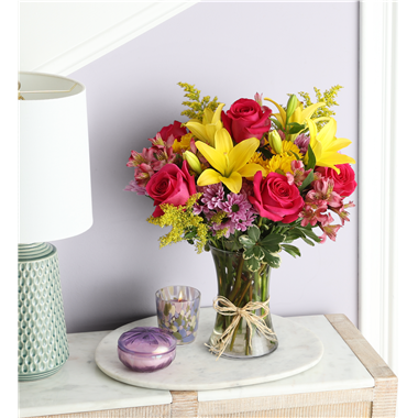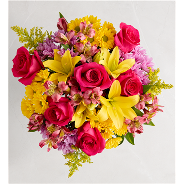 Inspired by the traditional hand-tied arrangements found in flower markets throughout Europe, our best-selling seasonal bouquet gathers a mix of vibrant blooms inside a classic glass vase tied with raffia. It will bring cheerful Old World charm to any springtime celebration.